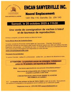 ENCAN CONSIGNATION SAMEDI 25 OCTOBRE 25 À 11H30 AVEC 2 TROUPEAUX Share This Story, Choose Your Platform! FacebookXRedditLinkedInWhatsAppTelegramTumblrPinterestVkXingEmail À propos de l'auteur : Encan Sawyerville Articles similaires TROUPEAU DE FERME WINDY WOOD VENDU LE SAMEDI 25 OCTOBRE Galerie NOUVELLE EMPLACEMENT À LA SUITE DE L’INCENDIE À DANVILLE Galerie ENCAN CONSIGNATION AUTOMNE 2025 Galerie ENCANS SPÉCIALISÉS DE VEAUX EMBOUCHE 2025 Galerie Laisser un commentaire Annuler la réponseCommentaire Enregistrez mon nom, e-mail et site Web dans ce navigateur pour la prochaine fois que je commenterai.